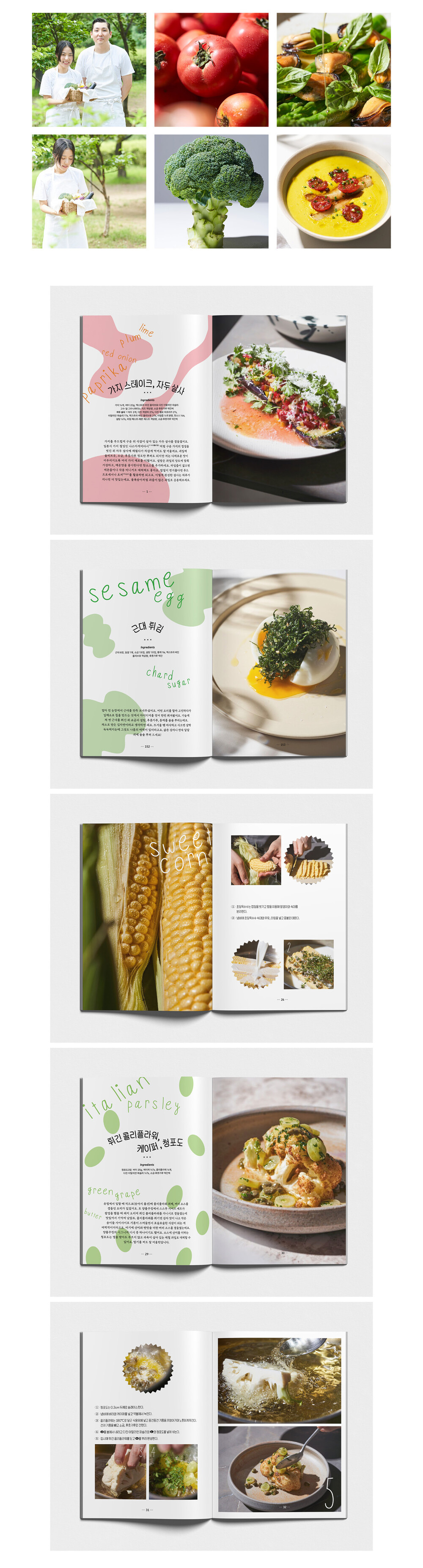 <양출 채소 레시피> 잎・열매 채소편에서는 가지, 오이, 토마토, 브로콜리 등 다양한 채소를 활용한 40가지 레시피를 소개합니다. <양출 채소 레시피>의 공통적인 특징은 재료도, 조리법도 쉽고 간단하지만 뻔하지 않고 참신하다는 것입니다. 주변에서 흔히 구할 수 있는 채소들도 두 사람의 손길을 거치면 세련되고 에지 있는 요리로 탈바꿈 됩니다. 여기에 심플하면서도 감각적인 플레이팅까지 더해지니 누구나 한 번쯤은 따라 해보고 싶어지죠.